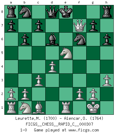 Last move : 1-0 2025 February 20 22:34:8 [Event "FICGS__CHESS__RAPID_C__000307"] [Site "FICGS"] [Date "2025.02.12"] [Round "1"] [White "Leurette,Marc-Antoine"] [Black "Alencar,Ofir"] [Result "1-0"] [WhiteElo "1700"] [BlackElo "1764"] 1.e4 d5 2.exd5 e6 3.dxe6 Bxe6 4.d4 Bb4+ 5.c3 Bd6 6.Nf3 Nf6 7.Bd3 h6 8.O-O Ng4 9.h3 Nf6 10.Qa4+ Bd7 11.Re1+ Be7 12.Qb3 b6 13.Ne5 Be6 14.Bc4 Bxc4 15.Qxc4 Bd6 16.Qxf7+ 1-0 Follow this game move after move (download)Chess is the gymnasium of the mind. (Blaise Pascal) Dass jemand wie Surab Asmaiparaschwili, der selbst Elopunkte gekauft hat , Vize-Präsident der Fide werden konnte, sagt schon einges über den Zustand dieser Organisation aus. (Joel Lautier) Un buen jugador siempre tiene buena suerte. (José Raúl Capablanca) Le système Elo représente seulement une moyenne. Il est simplement un indicateur de votre stabilité. (Anatoli Karpov) O divine art of subtlety and secrecy! Through you we learn to be invisible, through you inaudible and hence we can hold the enemy's fate in our hands. (Sun Tzu)