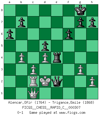 Last move : 0-1 2025 May 10 18:12:53 [Event "FICGS__CHESS__RAPID_C__000307"] [Site "FICGS"] [Date "2025.02.12"] [Round "1"] [White "Alencar,Ofir"] [Black "Trigance,Emile"] [Result "0-1"] [WhiteElo "1764"] [BlackElo "1868"] 1.d4 d5 2.Nf3 Nf6 3.Ne5 Nbd7 4.Nxd7 Bxd7 5.Nd2 e6 6.Nf3 Bb5 7.e3 Bxf1 8.Rxf1 c5 9.dxc5 Bxc5 10.Bd2 Ne4 11.Nd4 O-O 12.f3 Nxd2 13.Qxd2 a6 14.b4 Be7 15.a3 Bf6 16.f4 Re8 17.g3 e5 18.fxe5 Bxe5 19.Qf2 Qc7 20.Kd2 f6 21.Rac1 Rac8 22.c3 Qc4 23.Qe2 Qa2+ 24.Rc2 Qxa3 25.Qd1 Bxd4 26.exd4 Re4 27.Re1 Rce8 28.Qc1 Qb3 29.Rxe4 Rxe4 30.Qb2 Qc4 31.Qc1 Qe2+ 0-1 Follow this game move after move (download)Tactics flow from a superior position. (Bobby Fischer) Es ist schade, dass viele Schachsportler vergessen, wie wichtig Auftreten und angemessene Kleidung sind. (Alexandra Kosteniuk) El Ajedrez es el arte del análisis. (Mikhail Botvinnik) Le temps de noter son nom sur la feuille de partie, j'étais déjà en zeitnot ! D'un modeste amateur apparié lors de la première ronde d'un open contre le grand-maître Azmaïparashvili. Without deviation from the norm, progress is not possible. (Frank Zappa)