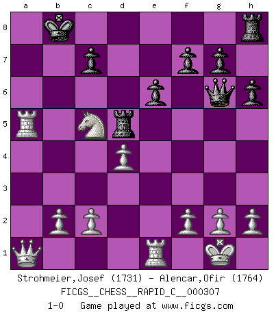 Last move : 1-0 2025 April 26 14:16:20 [Event "FICGS__CHESS__RAPID_C__000307"] [Site "FICGS"] [Date "2025.02.12"] [Round "1"] [White "Strohmeier,Josef"] [Black "Alencar,Ofir"] [Result "1-0"] [WhiteElo "1731"] [BlackElo "1764"] 1.e4 d5 2.exd5 Qxd5 3.Nc3 Qd8 4.d4 Nf6 5.Nf3 Nc6 6.Bb5 Bd7 7.O-O e6 8.Bg5 Be7 9.Re1 a6 10.Ba4 b5 11.Bb3 h6 12.Bh4 Nd5 13.Nxd5 Bxh4 14.Nxh4 Ne7 15.Nxe7 Qxe7 16.Nf5 Qf6 17.Ng3 O-O-O 18.Ne4 Qg6 19.Nc5 a5 20.a4 bxa4 21.Bxa4 Bxa4 22.Rxa4 Rd5 23.Rxa5 Kb8 24.Qa1 1-0 Follow this game move after move (download)Methodical thinking is of more use in Chess than inspiration. (C. J. S. Purdy) Der Traum, für den ich lebe, ist der von einem freien Russland. Viele mögen sagen: Russland hat doch ein Parlament, einen gewählten Präsidenten. Aber ich spüre, dass in meiner Heimat die Angst wiederkehrt. Eine Angst, sich frei zu äußern, bestimmte Dinge zu tun (Garry Kasparov) Con el fin de mejorar tu juego, debes de estudiar los finales antes que todo, ya que mientras que los finales pueden ser estudiados y dominados por sí mismos, el juegomedio y la apertura deben de ser estudiados en relación con los finales. (José Raúl Capablanca) 'L'échange des dames est un coup dur pour les deux adversaires...' Un journaliste lors d'une partie du match Spassky-Fischer Always remember that you are unique; just like everyone else. (Unknown)