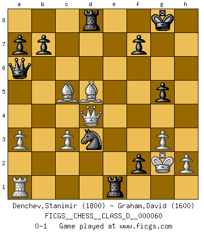 Last move : 0-1 2007 October 5 22:18:26 [Event "FICGS__CHESS__CLASS_D__000060"] [Site "FICGS"] [Date "2007.09.29"] [Round "1"] [White "Denchev,Stanimir"] [Black "Graham,David"] [Result "0-1"] [WhiteElo "1800"] [BlackElo "1600"] 1.d4 Nf6 2.c4 e6 3.Nc3 Bb4 4.a3 Bxc3+ 5.bxc3 c5 6.g3 Nc6 7.Bg2 Qa5 8.Bd2 d6 9.Nf3 O-O 10.O-O e5 11.Qc2 Qa6 12.Qa2 e4 13.Ng5 Bf5 14.dxc5 dxc5 15.Bf4 h6 16.Nh3 Rfe8 17.Be3 Be6 18.Nf4 Bxc4 19.Qd2 Rad8 20.Qc1 g5 21.Nh3 Ne5 22.Bxc5 Bxe2 23.Nxg5 Nd3 24.Qe3 Bxf1 25.Bxf1 Nd5 26.Qd4 hxg5 27.Bg2 e3 28.Bxd5 exf2+ 29.Kg2 Re1 0-1 Nimzo-Indian : Saemisch variation Kingside Castling by player Black (move 9) Kingside Castling by player White (move 10) Player Black won this chess game. Follow this game move after move (download)Daring ideas are like Chess men moved forward. They may be beaten, but they may start a winning game. (Johann Wolfgang von Goethe) Die Fehler sind da, Sie warten nur darauf gemacht zu werden. (Savielly Grigorievitsch Tartakower) No puedes jugar al Ajedrez si eres de corazón noble. (Proverbio Francés) Je ne suis pas le dernier à jouer lâchement des coups douteux pendant le zeïtnot de l'adversaire pour l'achever: en effet les coups qui font le plus peur sont ceux que l'on ne comprend pas. Je me fais souvent peur quand je joue. (Un professeur anonyme) As the days dwindle down... to a precious few. (Maxwell Anderson)