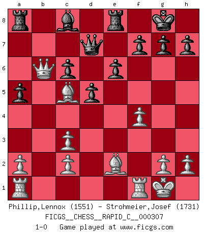 Last move : 1-0 2025 March 2 14:21:39 [Event "FICGS__CHESS__RAPID_C__000307"] [Site "FICGS"] [Date "2025.02.12"] [Round "1"] [White "Phillip,Lennox"] [Black "Strohmeier,Josef"] [Result "1-0"] [WhiteElo "1551"] [BlackElo "1731"] 1.e4 c5 2.Nf3 Nc6 3.d4 cxd4 4.Nxd4 Nf6 5.Nc3 e6 6.Be2 Bb4 7.O-O Bxc3 8.bxc3 Nxe4 9.Qd3 O-O 10.Qxe4 d5 11.Nxc6 bxc6 12.Qd4 Qe7 13.Be3 a5 14.Qb6 Qd7 15.Bc5 Re8 16.f4 1-0 Follow this game move after move (download)It is difficult to play against Einstein's theory --on his first loss to Fischer. (Mikhail Tal) Wenn man heute mit 14 Jahren noch kein GM ist, kann man es vergessen. (Viswanathan Anand) No existe un remordimiento como el remordimiento del Ajedrez. (H. G. Wells) Les Echecs, c'est l'art de la guerre sans les charniers, c'est la résurrection des morts tombés au champ d'honneur, l'espoir perpétuel, la suprématie de l'intelligence sur la force, la culture de l'esprit. (F. Szpiner) Life is pleasant. Death is peaceful. It's the transition that's troublesome. (Isaac Asimov)