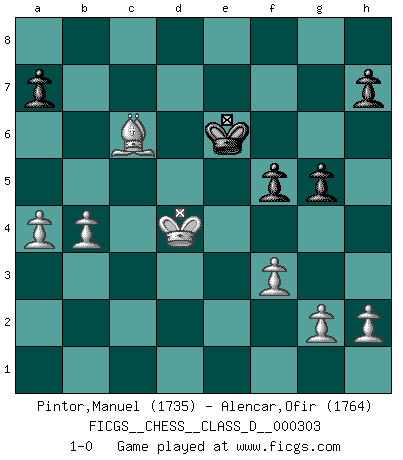 Last move : 1-0 2025 April 18 14:33:53 [Event "FICGS__CHESS__CLASS_D__000303"] [Site "FICGS"] [Date "2025.02.12"] [Round "1"] [White "Pintor,Manuel"] [Black "Alencar,Ofir"] [Result "1-0"] [WhiteElo "1735"] [BlackElo "1764"] 1.e4 d5 2.exd5 Qxd5 3.d4 Nc6 4.Nf3 e5 5.Nc3 Qd8 6.d5 Nd4 7.Nxd4 exd4 8.Qxd4 Qf6 9.Qe4+ Qe7 10.Bf4 Qxe4+ 11.Nxe4 Bd6 12.Bxd6 cxd6 13.Nxd6+ Ke7 14.Nxc8+ Rxc8 15.c4 Nf6 16.b3 Rhd8 17.f3 b5 18.Rc1 bxc4 19.d6+ Rxd6 20.Bxc4 R8c6 21.O-O Nd5 22.Rfe1+ Re6 23.Bxd5 Rxc1 24.Rxc1 Ra6 25.a4 Kf6 26.Rc6+ Rxc6 27.Bxc6 Ke6 28.Kf2 f6 29.Ke3 f5 30.Kd4 g5 31.b4 1-0 Follow this game move after move (download)I like the moment when I break a man's ego. (Bobby Fischer) Der Partner hat auch seine Existenzberechtigung. (Savielly Grigorievitsch Tartakower) Los finales de Peón son del Ajedrez lo que el cesped es del Golf. (Cecil Purdy) Je menace de comprendre la position. (Anonyme) Perhaps the current trend of many chess professionals taking up the more lucrative pastime of poker is not a wholly negative one. It may not be too late for humans to relearn how to take risks in order to innovate and thereby maintain the advanced lifestyles we enjoy. And if it takes a poker-playing supercomputer to remind us that we can't enjoy the rewards without taking the risks, so be it. (The Chess Master and the Computer, by Garry Kasparov - 2010)