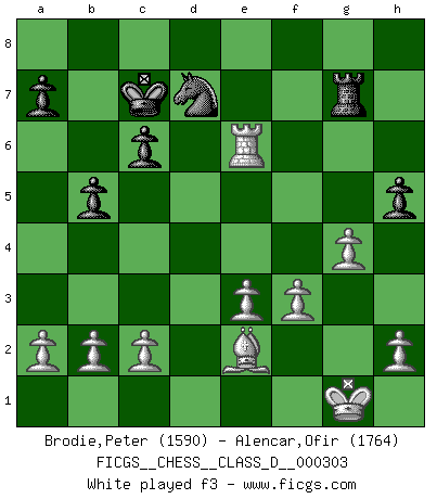 Last move : 1-0 2025 September 14 14:43:5 [Event "FICGS__CHESS__CLASS_D__000303"] [Site "FICGS"] [Date "2025.02.12"] [Round "1"] [White "Brodie,Peter"] [Black "Alencar,Ofir"] [Result "1-0"] [WhiteElo "1590"] [BlackElo "1764"] 1.Nf3 d5 2.d4 Nf6 3.Bf4 e6 4.Nc3 Ne4 5.Nxe4 dxe4 6.Ne5 Bd6 7.e3 Bxe5 8.Bxe5 f6 9.Bg3 e5 10.dxe5 fxe5 11.Qxd8+ Kxd8 12.Bxe5 Rg8 13.Rd1+ Bd7 14.Bb5 c6 15.Be2 Ke7 16.O-O Bf5 17.Bc4 Rd8 18.Rxd8 Kxd8 19.Bxg7 b5 20.Be2 Nd7 21.Rd1 Kc7 22.g4 Be6 23.Rd4 Rg8 24.Rxe4 Rxg7 25.Rxe6 h5 26.f3 1-0 Follow this game move after move (download)A bad day of Chess is better than any good day at work. (Anonymous) Wir irren allesamt, nur jeder irrt anders. (Georg Christoph Lichtenberg) Hay jugadores fuertes y personas amables y yo soy un jugador fuerte. (Bobby Fischer) La guerre est enfant de la passion, la passion est enfant du narcissisme et le narcissisme est l'enfant. (...) Une autre partie ? (Thibault de Vassal) The next best thing to gambling and winning is gambling and loosing. (Nick Dandalos)