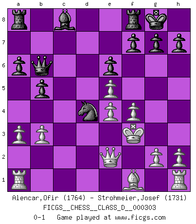 Last move : 0-1 2025 March 29 23:5:49 [Event "FICGS__CHESS__CLASS_D__000303"] [Site "FICGS"] [Date "2025.02.12"] [Round "1"] [White "Alencar,Ofir"] [Black "Strohmeier,Josef"] [Result "0-1"] [WhiteElo "1764"] [BlackElo "1731"] 1.d4 d5 2.Nf3 Nf6 3.Ne5 e6 4.Nc3 Be7 5.Bg5 O-O 6.Bxf6 Bxf6 7.e3 Bxe5 8.dxe5 a6 9.e4 d4 10.Ne2 c5 11.c3 Nc6 12.cxd4 cxd4 13.f4 b5 14.b3 Qa5+ 15.Kf2 Qb6 16.a3 d3 17.Kf3 dxe2 18.Qxe2 Nd4+ 0-1 Follow this game move after move (download)One doesn't have to play well, it's enough to play better than your opponent. (Siegbert Tarrasch) Nie in meinem Leben habe ich die französische Verteidigung gespielt, welche die Stumpfsinnigste von allen ist. (Wilhelm Steinitz) Yo considero que Fischer es uno de los expertos mas grandes de aperturas de siempre. (Keith Hayward) Celui qui prend des risques peut perdre, celui qui n'en prend pas perd toujours. (Xavier Tartacover) It's not a bug - it's an undocumented feature. (Anonymous)