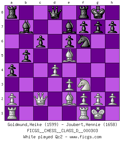 Last move : 0-1 2025 December 10 7:34:26 [Event "FICGS__CHESS__CLASS_D__000303"] [Site "FICGS"] [Date "2025.02.12"] [Round "1"] [White "Goldmund,Heike"] [Black "Joubert,Hennie"] [Result "0-1"] [WhiteElo "1599"] [BlackElo "1658"] 1.d4 d5 2.Nf3 Nf6 3.Bf4 e6 4.e3 Be7 5.Bd3 O-O 6.O-O c6 7.c4 Nbd7 8.Ne5 dxc4 9.Be2 b5 10.b3 cxb3 11.Qxb3 Nxe5 12.Bxe5 Bb7 13.Nd2 a5 14.Nf3 a4 15.Qc2 Nd5 16.a3 Rc8 17.Qe4 Nc3 18.Qd3 Nxe2+ 19.Qxe2 Bd6 20.Rfd1 Qe7 21.Bxd6 Qxd6 22.Ng5 h6 23.Ne4 Qd5 24.Nc5 Ba8 25.Qa2 Rfd8 26.Qxd5 cxd5 27.Rab1 Rb8 28.Na6 Rb7 29.Rdc1 Rb6 30.Nc7 Bc6 31.Rc5 Rdb8 32.f3 R8b7 33.Na8 Ra6 34.Kf2 Rxa8 35.Rxc6 b4 36.Rxb4 Rxb4 37.axb4 a3 38.Rc1 a2 39.Ra1 Kf8 40.Ke2 Ke7 41.Kd3 Kd6 42.Kc3 Kc6 43.e4 Kb5 44.Kb3 Ra4 45.Kc3 Ra3+ 46.Kb2 Kxb4 47.Rxa2 Rxa2+ 48.Kxa2 Kc3 49.Ka3 Kxd4 50.Kb4 dxe4 51.fxe4 Kxe4 52.Kc5 Kf4 53.Kd6 Ke3 54.Ke7 e5 55.Kxf7 Kf2 56.g4 e4 57.Kxg7 e3 58.Kxh6 e2 59.g5 e1Q 60.g6 Qe3+ 61.Kg7 Qe7+ 62.Kh6 Qh4+ 63.Kg7 Qg5 64.Kf7 Qf5+ 65.Kg7 Kf3 66.h4 Kg4 67.h5 Kxh5 68.Kh7 Qxg6+ 69.Kh8 Qd6 70.Kg8 Kg6 71.Kh8 Qf8+ 0-1 Follow this game move after move (download)Kasparov : J'adoube , Ivanchuk : S'il vous plaît ! (Garry Kasparov & Vassily Ivanchuk, Linares 1997) Ich brauche nur einen Blick auf das Schachbrett zu werfen, und weiß schon, was in der Stellung steckt, was geschehen kann und was geschehen wird. Alle übrigen suchen und prüfen, ich aber weiß es! (José Raúl Capablanca) En posiciones complicadas, Bobby Fischer pocas veces tuvo que temer de cualquiera. (Paul Keres) Dans le domaine de la peinture, de la gravure et de la sculpture, dès la première décennie de notre siècle, les artistes abandonnent la représentation de la partie d'échecs pour se concentrer sur les pièces, sur les échiquiers et sur toutes les variations auxquelles les unes et les autres peuvent donner lieu. On passe en quelque sorte d'un thème social à un thème musical (au sens de la musica médiévale, c'est-à -dire d'une notion qui inclue le rythme, l'harmonie, la construction et la déconstruction, etc.). Graphiquement et picturalement, l'échiquier apparaît comme une structure ouverte, dynamique, d'une richesse infinie, autorisant toutes les combinatoires et débouchant sur des mouvements et des rythmes de nature exponentielle. (Michel Pastoureau) The question of whether computers can think is just like question of whether submarines can swim. (Edsger W. Dijkstra)