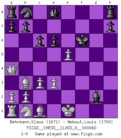 Last move : 1-0 2007 October 18 14:58:51 [Event "FICGS__CHESS__CLASS_D__000060"] [Site "FICGS"] [Date "2007.09.29"] [Round "1"] [White "Behrmann,Klaus"] [Black "Nebout,Louis"] [Result "1-0"] [WhiteElo "1671"] [BlackElo "1700"] 1.e4 e5 2.f4 exf4 3.Nf3 d6 4.Bc4 Bg4 5.d3 g5 6.h4 Be7 7.hxg5 Bxg5 8.c3 Bh4+ 9.Rxh4 Bxf3 10.Qa4+ c6 11.Bxf7+ Kf8 12.Rxf4 Nf6 13.Be6 Ke7 14.Bb3 Bxg2 15.Rxf6 Kxf6 16.e5+ 1-0 KGA : Fischer defense Player White won this chess game. Follow this game move after move (download)Chess opens and enriches your mind. (Saudin Robovic) Das Schachspiel ist ein See, in welchem eine Mücke baden und ein Elefant ertrinken kann. (Emanuel Lasker) Solo los afeminados hacen el Enroque. (Rob Sillars) Le plus grand jeu de l'esprit jamais inventé, plus vous l'apprenez, plus vous y prenez du plaisir. (Garry Kasparov) War is the child of passion, passion is the child of narcissism and narcissism is the child. (...) Another game ? (Thibault de Vassal)