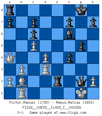 Last move : 0-1 2025 April 22 10:14:45 [Event "FICGS__CHESS__CLASS_C__000326"] [Site "FICGS"] [Date "2025.02.15"] [Round "1"] [White "Pintor,Manuel"] [Black "Remus,Matias"] [Result "0-1"] [WhiteElo "1735"] [BlackElo "1802"] 1.e4 e5 2.f4 exf4 3.Nf3 Nf6 4.Nc3 d5 5.exd5 Nxd5 6.Nxd5 Qxd5 7.d4 Be7 8.Be2 Nc6 9.O-O g5 10.c4 Qd6 11.c5 Qd5 12.Bb5 Bg4 13.Qa4 Bxf3 14.Rxf3 Bf6 15.Rd3 O-O 16.Bxc6 bxc6 17.b3 Rfe8 18.Bb2 Re2 19.Rb1 Qxg2+ 0-1 Follow this game move after move (download)Weak points or holes in the opponent's position must be occupied by pieces not Pawns. (Siegbert Tarrasch) Ein Schachspiel besteht aus drei Phasen: Die erste, wenn du hofftst den Vorteil zu haben, die zweite, wenn du glaubst einen Vorteil zu haben, und die dritte.... wenn du weißt Du wirst verlieren. (Savielly Grigorievitsch Tartakower) En el Ajedrez, tal como en la vida, las bendiciones de hoy pueden ser el veneno del mañana. (Assaic) On peut tirer plus d'utilité d'une partie perdue que de 100 parties gagnées. (Capablanca) But they are useless. They can only give you answers. (Pablo Picasso, about computers)