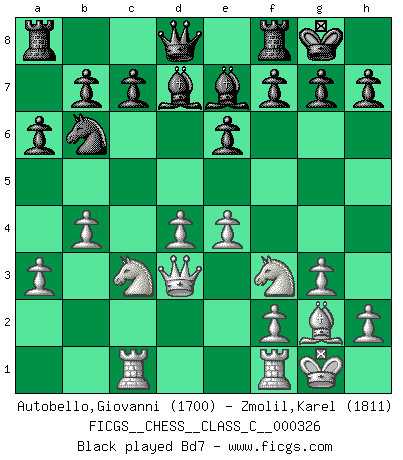 Last move : 0-1 2025 August 21 0:37:12 [Event "FICGS__CHESS__CLASS_C__000326"] [Site "FICGS"] [Date "2025.02.15"] [Round "1"] [White "Autobello,Giovanni"] [Black "Zmolil,Karel"] [Result "0-1"] [WhiteElo "1700"] [BlackElo "1811"] 1.d4 d5 2.c4 dxc4 3.Nf3 Nf6 4.Nc3 e6 5.g3 Bb4 6.Qa4+ Nc6 7.a3 Be7 8.Qxc4 a6 9.Bg2 Nd5 10.e4 Nb6 11.Qd3 Na5 12.O-O Nb3 13.Rb1 Nxc1 14.Rbxc1 O-O 15.b4 Bd7 16.Rfd1 Na4 17.Nxa4 Bxa4 18.Rd2 Bb5 19.Qc3 Rc8 20.d5 exd5 21.Rxd5 Qe8 22.Bh3 c6 23.Bxc8 Qxc8 24.e5 Be2 25.Nd4 Bg4 26.Nb3 cxd5 27.Qd4 Qd7 28.Nc5 Bxc5 29.Rxc5 Bf3 30.Qh4 Rb8 31.Qf4 Bg4 32.Qd4 Rd8 33.f4 Bf3 34.Rc3 Be4 0-1 This chess game has been lost on time (started : 2025.02.15 14:27:43) Follow this game move after move (download)Chess is as much a mystery as women. (Purdy) Modernes Schach erfordert enorme Anspannung. Es ist für einen normalen Menschen unmöglich das auszuhalten. (Viktor Kortschnoi) Un sacrificio se refuta mucho mejor al aceptarlo. (Wilhelm Steinitz) Toute estimation doit être constamment réévaluée. (Jacob Estrin) If things go wrong, don't go with them. (Roger Babson)