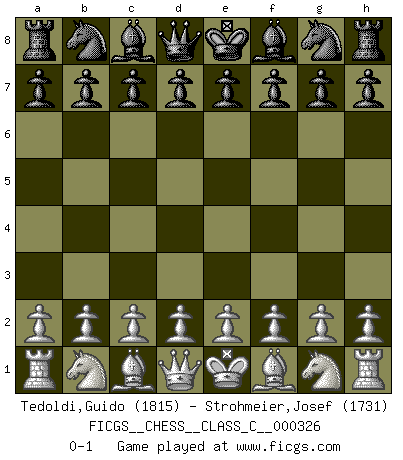 Last move : 0-1 2025 March 28 0:58:10 [Event "FICGS__CHESS__CLASS_C__000326"] [Site "FICGS"] [Date "2025.02.15"] [Round "1"] [White "Tedoldi,Guido"] [Black "Strohmeier,Josef"] [Result "0-1"] [WhiteElo "1815"] [BlackElo "1731"] 0-1 This chess game has been lost on time (started : 2025.02.15 14:27:43) Follow this game move after move (download)My style is somewhere between that of Tal and Petrosian. (Reshevsky) Schach ist die gewalttätigste aller Sportarten. (Garry Kasparov) La vida es como el Ajedrez, con lucha, competición y eventos buenos y malos. (Benjamin Franklin) La victoire dans une partie d'Echecs appartient la plupart du temps à celui qui voit un peu plus loin que l'adversaire. (Lasker) Heh, heh, heh. Time to abandon ship. (General Grievous in Star Wars ep.3)