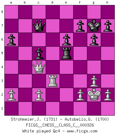 Last move : 1-0 2025 July 30 2:8:17 [Event "FICGS__CHESS__CLASS_C__000326"] [Site "FICGS"] [Date "2025.02.15"] [Round "1"] [White "Strohmeier,Josef"] [Black "Autobello,Giovanni"] [Result "1-0"] [WhiteElo "1731"] [BlackElo "1700"] 1.e4 c5 2.Nf3 d6 3.d4 cxd4 4.Nxd4 Nf6 5.Nc3 a6 6.g3 Nc6 7.Be3 g6 8.Bg2 Bg7 9.O-O O-O 10.Qd2 Nxd4 11.Bxd4 Bd7 12.Rad1 Bc6 13.Be3 Qa5 14.Bh6 Qb4 15.Bxg7 Kxg7 16.Rfe1 Qxb2 17.Rb1 Qa3 18.e5 dxe5 19.Rxe5 e6 20.Bxc6 bxc6 21.Rb3 Qe7 22.Re3 Rfd8 23.Qe2 Qd6 24.Rd3 Qc7 25.Rxd8 Rxd8 26.Ne4 Nxe4 27.Qxe4 Rd5 28.Kg2 c5 29.Rd3 Re5 30.Qc4 1-0 This chess game has been lost on time (started : 2025.02.15 14:27:43) Follow this game move after move (download)When I asked Fischer why he had not played a certain move in our game, he replied: 'Well, you laughed when I wrote it down !' (Mikhail Tal) Das Spiel gibt uns die Genugtuung, die das Leben uns versagt. (Emanuel Lasker) Te sientas frente a un tablero y repentinamente tu corazón brinca. Tu mano tiembla al tomar una pieza y moverla. Pero lo que el Ajedrez te enseña es que tu debes permanecer ahí con calma y pensar de que si realmente es una buena idea o de que si hay otras ideas mejores. (Stanley Kubrick) Aucun coup ne doit être joué sans but. (Pedro Damiano) There are three kinds of lies: lies, damned lies and statistics. (Mark Twain)