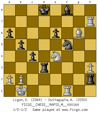 Last move : 1/2-1/2 2025 April 29 10:35:21 [Event "FICGS__CHESS__RAPID_M__000164"] [Site "FICGS"] [Date "2025.02.15"] [Round "1"] [White "Ligon,Scott"] [Black "Duttagupta,Aniruddha"] [Result "1/2-1/2"] [WhiteElo "2364"] [BlackElo "2253"] 1.e4 c6 2.d4 d5 3.e5 Bf5 4.Nf3 e6 5.Be2 c5 6.Be3 cxd4 7.Nxd4 Ne7 8.c4 Nbc6 9.Qa4 a6 10.Nc3 dxc4 11.O-O-O Qa5 12.Nxf5 Nxf5 13.Qxa5 Nxa5 14.Bb6 Nc6 15.f4 Rc8 16.g3 Be7 17.Bf3 g5 18.Rd2 gxf4 19.gxf4 Nh4 20.Be4 Rg8 21.h3 Ng6 22.Rg2 Rf8 23.Rf1 f5 24.exf6 Rxf6 25.f5 Nh4 26.Rg8+ Bf8 27.Bc5 Ne7 28.Bxe7 Kxe7 29.Kb1 b5 30.Rh8 Nxf5 31.Rxh7+ Ng7 32.Rg1 Rb8 33.Bg6 Rf4 34.Ne2 Rf2 35.Ng3 Rd8 36.Ne4 Rh2 37.Rh8 Rd3 38.Rf1 Nf5 39.Rh7+ Kd8 1/2-1/2 Follow this game move after move (download)Capture of the adverse King is the ultimate but not the first object of the game. (William Steinitz) Schach ist ein schwarz-weisser Dschungel. (Garry Kasparov) El Ajedrez es sobre todo, ¡una pelea!. (Emanuel Lasker) RxDa4 pat (...) He who fights with monsters should be careful lest he thereby become a monster. (Friedrich Nietzsche, Beyond Good and Evil)