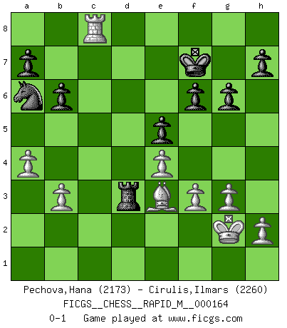 Last move : 0-1 2025 June 2 18:48:31 [Event "FICGS__CHESS__RAPID_M__000164"] [Site "FICGS"] [Date "2025.02.15"] [Round "1"] [White "Pechova,Hana"] [Black "Cirulis,Ilmars"] [Result "0-1"] [WhiteElo "2173"] [BlackElo "2260"] 1.c4 c5 2.Nf3 b6 3.g3 Bb7 4.Bg2 g6 5.O-O Bg7 6.Nc3 Nf6 7.d4 cxd4 8.Nxd4 Bxg2 9.Kxg2 Qc8 10.b3 Qb7+ 11.f3 d5 12.cxd5 Nxd5 13.Nxd5 Qxd5 14.Be3 Na6 15.Rc1 Bxd4 16.Qxd4 Qxd4 17.Bxd4 O-O 18.Rc4 Rfc8 19.Rfc1 Rxc4 20.Rxc4 Rd8 21.a4 f6 22.e4 e5 23.Be3 Rd3 24.Rc8+ Kf7 0-1 Follow this game move after move (download)Later, I began to succeed in decisive games. Perhaps because I realized a very simple truth: not only was I worried, but also my opponent. (Mikhail Tal) Ich kenne keine einzige Person, die behaupten würde, Garri Kasparow sei ein guter Mensch (Nigel Short) Un jugador que es sorprendido, esta derrotado a medias. (Proverbio) Dans le domaine de la peinture, de la gravure et de la sculpture, dès la première décennie de notre siècle, les artistes abandonnent la représentation de la partie d'échecs pour se concentrer sur les pièces, sur les échiquiers et sur toutes les variations auxquelles les unes et les autres peuvent donner lieu. On passe en quelque sorte d'un thème social à un thème musical (au sens de la musica médiévale, c'est-à-dire d'une notion qui inclue le rythme, l'harmonie, la construction et la déconstruction, etc.). Graphiquement et picturalement, l'échiquier apparaît comme une structure ouverte, dynamique, d'une richesse infinie, autorisant toutes les combinatoires et débouchant sur des mouvements et des rythmes de nature exponentielle. (Michel Pastoureau) When it is a question of money, everybody is of the same religion. (Voltaire)