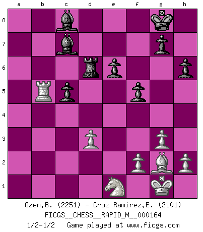 Last move : 1/2-1/2 2025 April 1 12:13:58 [Event "FICGS__CHESS__RAPID_M__000164"] [Site "FICGS"] [Date "2025.02.15"] [Round "1"] [White "Ozen,Bahadir"] [Black "Cruz Ramirez,Eliecer"] [Result "1/2-1/2"] [WhiteElo "2251"] [BlackElo "2101"] 1.Nf3 Nf6 2.g3 d5 3.Bg2 c5 4.O-O e6 5.c4 d4 6.e3 Nc6 7.d3 Bd6 8.exd4 cxd4 9.Bg5 h6 10.Bxf6 Qxf6 11.Nbd2 Qe7 12.a3 a5 13.Ne4 Bc7 14.b4 axb4 15.axb4 Rxa1 16.Qxa1 f5 17.Nc5 O-O 18.Rb1 Nxb4 19.Rxb4 Qxc5 20.Rb5 Qd6 21.Qxd4 Rd8 22.Qxd6 Rxd6 23.Ne1 b6 24.c5 bxc5 1/2-1/2 Follow this game move after move (download)Examine moves that smite! A good eye for smites is far more important than a knowledge of strategical principles. (Purdy) Warum muß ich gegen diesen IDIOTEN verlieren? (Aaron Nimzowitsch) Si el Ajedrez es una ciencia, es la mas inexacta. Si el Ajedrez es un arte, es demasiado inexacto para ser visto como tal. Si el Ajedrez es un deporte, es demasiado esotérico. Si el Ajedrez es un juego, es demasiado exigente para ser solo un juego. Si el Ajedrez es una aventura, es una muy demandante. Si el Ajedrez es una pasión, es una muy gratificante. Si el Ajedrez es la vida, es una muy triste. (Anónimo) On entre au jeu d'Echecs comme on entre en Religion. Pour le joueur d'Echecs, la partie d'Echecs c'est l'office, la messe, le défilé du 1er Mai, le dépôt de gerbe au Monument aux Morts. C'est un drame sacré. (Michel Roos) Treat your password like your toothbrush. Don't let anybody else use it, and get a new one every six months. (Clifford Stoll)