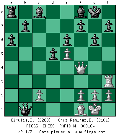 Last move : 1/2-1/2 2025 April 10 14:4:59 [Event "FICGS__CHESS__RAPID_M__000164"] [Site "FICGS"] [Date "2025.02.15"] [Round "1"] [White "Cirulis,Ilmars"] [Black "Cruz Ramirez,Eliecer"] [Result "1/2-1/2"] [WhiteElo "2260"] [BlackElo "2101"] 1.d4 Nf6 2.Bf4 c5 3.e3 d5 4.Nd2 Qb6 5.Ngf3 Nc6 6.dxc5 Qxb2 7.Rb1 Qc3 8.Bb5 e6 9.O-O Be7 10.e4 O-O 11.e5 Nd7 12.Nb3 Qb4 13.Nbd4 Qxc5 14.Re1 a6 15.Bf1 Nxd4 16.Nxd4 Qa5 17.Re3 Nc5 18.Rh3 g6 19.Nb3 Qa4 20.Bh6 Ne4 21.Bxf8 Bxf8 22.Nd2 Nxd2 23.Qxd2 Qxa2 24.Qf4 Qxb1 1/2-1/2 Follow this game move after move (download)The defensive power of a pinned piece is only imaginary. (Aaron Nimzovich) Garry Kasparov war erst in der Großmeister-Organisation GMA, dann in der Profischach-Vereinigung PCA, zum Schluss kehrte er wieder in den Schoß der FIDE zurück. Aber gut, manche Leute sind flexibel (Viswanathan Anand) De todos mis libros Rusos, la defensa contiene y difunde el 'calor' mas grande que pudiese verse extraño al observar lo supremamente abstracto que el Ajedrez supuestamente es. (Vladimir Nabokov) Ce n'est pas pour s'amuser qu'il joue aux échecs : il célèbre un culte. (Vladimir Nabokov) I couldn't make any sense out of what this particular thread is about. It sounds like R2 D2 computer speaking. A space fight ?!? Some 'command' problems in Moscow ? Some killers & narcotic addicts attacking some game & a god wannabe ?? (Dinesh De Silva, lost in a russian conflict in FICGS forum)