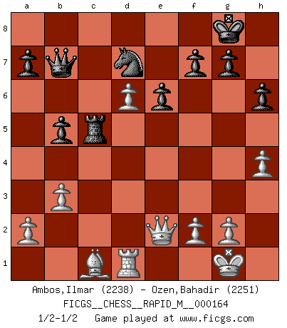 Last move : 1/2-1/2 2025 March 9 18:43:1 [Event "FICGS__CHESS__RAPID_M__000164"] [Site "FICGS"] [Date "2025.02.15"] [Round "1"] [White "Ambos,Ilmar"] [Black "Ozen,Bahadir"] [Result "1/2-1/2"] [WhiteElo "2238"] [BlackElo "2251"] 1.d4 d5 2.c4 e6 3.Nf3 Nf6 4.Nc3 Be7 5.Bf4 O-O 6.e3 b6 7.Bd3 dxc4 8.Bxc4 Ba6 9.Qe2 Bxc4 10.Qxc4 c5 11.dxc5 Bxc5 12.Rc1 Nbd7 13.O-O Qc8 14.Qe2 Qb7 15.e4 Rfd8 16.e5 Nd5 17.Nxd5 Qxd5 18.Rfd1 Qb7 19.Bg5 Rdc8 20.Nd2 h6 21.Bf4 Rc6 22.h4 Rac8 23.Nc4 Bf8 24.Be3 R6c7 25.b3 b5 26.Nd6 Bxd6 27.exd6 Rxc1 28.Bxc1 Rc5 1/2-1/2 Follow this game move after move (download)You may learn much more from a game you lose than from a game you win. You will have to lose hundreds of games before becoming a good player. (Jose Raul Capablanca) Im Schach gewinnt jeder. Hat man Freunde am Spiel - und das ist die Hauptsache - ist auch der Verlust einer Partie kein Unglück. (David Bronstein) El jugador de combinación piensa hacia adelante; comienza de la posición dada y trabaja las movidas contundentes en su mente. (Emanuel Lasker) Comme les marins qui ont mille raisons différentes d'aller en mer, les joueurs d'échecs en ont tout autant avant de s'installer devant une table et jouer... (Vincent Bertignac, philosophe) Don't be discouraged. It's often the last key in the bunch that opens the lock. (Author unknown)