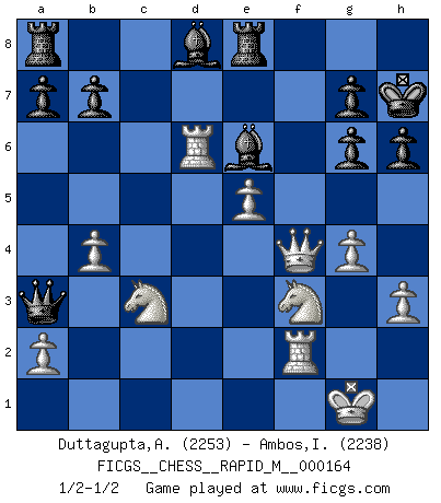 Last move : 1/2-1/2 2025 April 2 16:42:20 [Event "FICGS__CHESS__RAPID_M__000164"] [Site "FICGS"] [Date "2025.02.15"] [Round "1"] [White "Duttagupta,Aniruddha"] [Black "Ambos,Ilmar"] [Result "1/2-1/2"] [WhiteElo "2253"] [BlackElo "2238"] 1.d4 Nf6 2.c4 e6 3.Nc3 d5 4.cxd5 exd5 5.Bg5 Be7 6.e3 c6 7.Bd3 O-O 8.Qc2 Nbd7 9.Nge2 Re8 10.O-O Nf8 11.f3 Ng6 12.Rad1 h6 13.Bxf6 Bxf6 14.Bxg6 fxg6 15.e4 dxe4 16.fxe4 Bg5 17.h3 Kh7 18.e5 c5 19.Qe4 cxd4 20.Nxd4 Bf6 21.Nf3 Qb6+ 22.Rf2 Bf5 23.Qf4 Bd8 24.Rd6 Qa5 25.g4 Be6 26.b4 Qa3 1/2-1/2 Follow this game move after move (download)Look at Garry Kasparov. After he loses, invariably he wins the next game. He just kills the next guy. That's something that we have to learn to be able to do. (Maurice Ashley) Du weisst es gibt ein Problem mit Computern und Fernschach, wenn jeder eine Rating von 2450 hat. (John Christen Knudsen) La pasion por jugar al Ajedrez es una de las mas inexplicables en el mundo. (H.G. Wells) Des combinaisons [dans le jeu d'échecs] pareilles à des mélodies. Je crois entendre pour ainsi dire la musique des coups... (Vladimir Nabokov) It's not enough to succeed. Others must fail. (Gore Vidal)