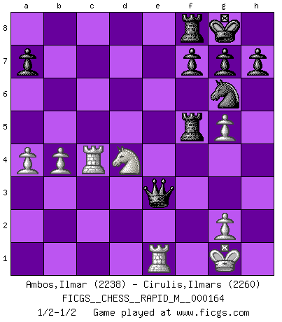 Last move : 1/2-1/2 2025 March 26 10:9:31 [Event "FICGS__CHESS__RAPID_M__000164"] [Site "FICGS"] [Date "2025.02.15"] [Round "1"] [White "Ambos,Ilmar"] [Black "Cirulis,Ilmars"] [Result "1/2-1/2"] [WhiteElo "2238"] [BlackElo "2260"] 1.e4 e5 2.Nf3 Nc6 3.d4 exd4 4.Nxd4 Bc5 5.Be3 Qf6 6.c3 Nge7 7.Bc4 d6 8.O-O Ne5 9.Be2 Qg6 10.f3 O-O 11.Nd2 d5 12.Kh1 dxe4 13.fxe4 Bg4 14.Bf4 Bd6 15.Bxg4 Nxg4 16.Bxd6 cxd6 17.Qb3 d5 18.Rae1 Qh6 19.h3 Qxd2 20.hxg4 Nc6 21.Nf3 Qh6+ 22.Kg1 dxe4 23.Rxe4 Qd6 24.g5 Rac8 25.Rd1 Qc5+ 26.Kf1 Rcd8 27.Rde1 b5 28.c4 bxc4 29.Rxc4 Qd6 30.Qc3 Ne7 31.Kg1 Ng6 32.b4 Qg3 33.Qe3 Rd5 34.a4 Rf5 35.Nd4 Qxe3+ 1/2-1/2 Follow this game move after move (download)Chess is life. (Bobby Fischer) Ein bischen Romantik kann weder im Schach noch in der Liebe schaden. Also versuche ich mich ab und zu daran zu erinnern. (Nigel Short) Yo nunca en mi vida he jugado la Defensa Francesa, que viene siendo la más aburrida de todas las Aperturas. (Wilhelm Steinitz) Fischer est le meilleur joueur du monde et Karpov n'est qu'un joueur de bistrot. (Garry Kasparov, agé de 16 ans) Knowledge rests not upon truth alone, but upon error also. (Carl G. Jung)