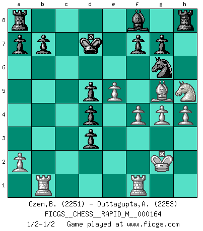 Last move : 1/2-1/2 2025 March 12 5:45:32 [Event "FICGS__CHESS__RAPID_M__000164"] [Site "FICGS"] [Date "2025.02.15"] [Round "1"] [White "Ozen,Bahadir"] [Black "Duttagupta,Aniruddha"] [Result "1/2-1/2"] [WhiteElo "2251"] [BlackElo "2253"] 1.e4 c6 2.d4 d5 3.e5 Bf5 4.h4 h5 5.c4 e6 6.Nc3 Ne7 7.Nge2 Nd7 8.Ng3 Bg6 9.Bg5 Qb6 10.Rc1 Qxb2 11.Bd3 dxc4 12.Bxg6 Nxg6 13.Nge4 Nb6 14.O-O Nd5 15.Nxd5 exd5 16.Ng3 Qa3 17.Nxh5 Qd3 18.Qxd3 cxd3 19.g4 Kd7 20.Kg2 c5 21.f4 cxd4 22.Rb1 1/2-1/2 Follow this game move after move (download)Excellence at Chess is one mark of a scheming mind. (Sir Arthur Conan Doyle) Wenn Du nicht kämpfst, um anderen etwas zu beweisen, sondern nur für Dich selbst, dann bist du fast unbesiegbar. (Garry Kasparov) El Ajedrez es una manera fabulosa para que los niños aprendan a autovalorarse y a autoestimarse. (Saudin Robovic) La vie est comme un jeu d'échecs : nous esquissons un plan, mais celui-ci est tributaire de ce que daignent faire l'adversaire aux échecs et le destin dans la vie. (Arthur Schopenhauer) He who is a good ruler must first have been ruled. (Aristotle)