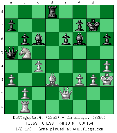 Last move : 1/2-1/2 2025 April 21 9:8:36 [Event "FICGS__CHESS__RAPID_M__000164"] [Site "FICGS"] [Date "2025.02.15"] [Round "1"] [White "Duttagupta,Aniruddha"] [Black "Cirulis,Ilmars"] [Result "1/2-1/2"] [WhiteElo "2253"] [BlackElo "2260"] 1.c4 c5 2.Nf3 b6 3.Nc3 Bb7 4.e4 e6 5.d4 cxd4 6.Nxd4 Nf6 7.f3 Nc6 8.Be3 Be7 9.Be2 O-O 10.O-O Qb8 11.Kh1 Nxd4 12.Bxd4 Bd6 13.Bxf6 gxf6 14.Qe1 Bf4 15.Rd1 Qe5 16.g3 Bh6 17.Rxd7 Bc6 18.Rd3 f5 19.exf5 Qxf5 20.Kg2 Bg5 21.Qf2 Rfd8 22.Rfd1 Qa5 23.a3 Rxd3 24.Bxd3 Rd8 25.Qc2 Kg7 26.h4 Be7 27.Nb5 h6 28.Qe2 Bf6 29.Kh3 Kg8 30.Qe3 Kg7 31.Qe2 Kg8 32.Rb1 Kg7 33.Rc1 Kf8 34.Rb1 Kg7 1/2-1/2 Follow this game move after move (download)Chess is a terrible game. If you have no center, your opponent has a freer position. If you do have a center, then you really have something to worry about ! (Siegbert Tarrasch) Die unerbitterlichsten Regeln im Schach sind die Ausnahmen. (Savielly Grigorievitsch Tartakower) El Ajedrez es 99 por ciento táctica. (Teichmann) Vous n'êtes pas toujours obligé de jouer le meilleur coup. Un coup doit être actif, entreprenant, correct et beau ! (David Bronstein) Pretend inferiority and encourage his arrogance. (Sun Tzu)