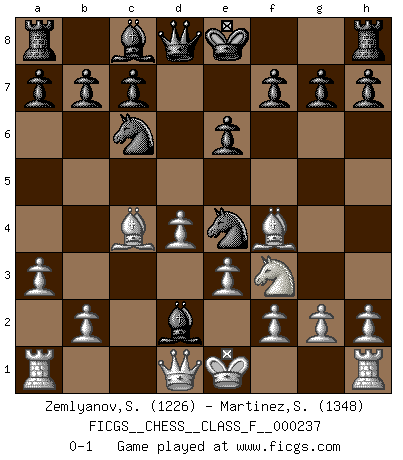 Last move : 0-1 2025 April 21 11:16:46 [Event "FICGS__CHESS__CLASS_F__000237"] [Site "FICGS"] [Date "2025.02.23"] [Round "1"] [White "Zemlyanov,Sergey"] [Black "Martinez,Silvio"] [Result "0-1"] [WhiteElo "1226"] [BlackElo "1348"] 1.d4 d5 2.Bf4 Nf6 3.e3 Nc6 4.Nf3 e6 5.c4 dxc4 6.Bxc4 Bb4+ 7.Nbd2 Ne4 8.a3 Bxd2+ 0-1 This chess game has been lost on time (started : 2025.02.23 8:59:29) Follow this game move after move (download)Chess is the art of analysis. (Mikhail Botvinnik) Kein Schachspieler kann gut schlafen. (H. G. Wells) Cuando tengo las piezas blancas, yo gano porque soy blanco; Cuando tengo las piezas negras, yo gano porque soy Bogolyubov. (Bogolyubov) Toutes les manuvres exécutées sur une colonne ouverte ont pour but ultime l'intrusion définitive sur la septième ou la huitième rangée, en plein cur de la position ennemie. (Aaron Nimzovitch) Rules and bones are meant to be broken. (Anonymous)