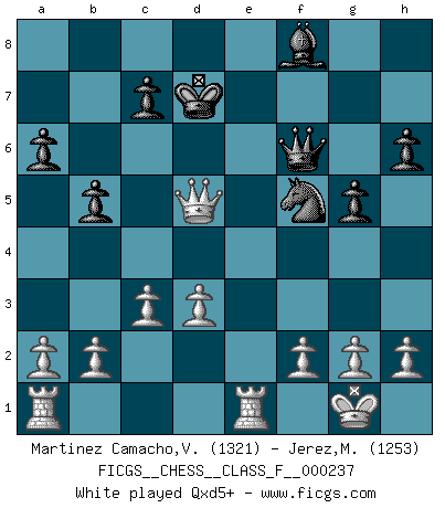 Last move : 1-0 2025 July 9 1:19:35 [Event "FICGS__CHESS__CLASS_F__000237"] [Site "FICGS"] [Date "2025.02.23"] [Round "1"] [White "Martinez Camacho,Victor Hugo"] [Black "Jerez,Miriam"] [Result "1-0"] [WhiteElo "1321"] [BlackElo "1253"] 1.e4 e5 2.Nf3 Nc6 3.Bb5 Nf6 4.O-O a6 5.Ba4 b5 6.Bb3 Nxe4 7.Re1 d5 8.d3 Nf6 9.Bg5 h6 10.Bxf6 Qxf6 11.Bxd5 Bb7 12.Nxe5 Rd8 13.Nxf7 Ne7 14.Nxh8 Bxd5 15.Nc3 g5 16.Nxd5 Rxd5 17.Qd2 Qxh8 18.c3 Kd8 19.Qe3 Nf5 20.Qa7 Qf6 21.Qa8+ Kd7 22.Qxd5+ Kc8 23.Qa8+ Kd7 24.Qd5+ Bd6 25.Re2 Kc8 26.Qa8+ Kd7 27.Qe8+ 1-0 Follow this game move after move (download)In order to improve your game, you must study the endgame before everything else, for whereas the endings can be studied and mastered by themselves, the middle game and the opening must be studied in relation to the endgame. (Jose Raul Capablanca) Über Frauen: Chess is better. (Robert James Fischer) Muchos jugadores de Ajedrez se sorprendían cuando después de la partida, Fischer explicaba con calma: 'Yo ya había analizado esta posibilidad' en una posición en la cual yo creía que no era posible de prever desde la apertura. (Mikhail Tal) Psychologiquement, tu dois avoir confiance en toi même, mais cette confiance doit être basée sur des faits. (Robert Fischer) Ah, beer! The cause of, and the solution to, all of life's problems. (Homer Simpson)