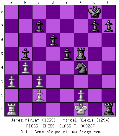 Last move : 0-1 2025 May 2 21:49:49 [Event "FICGS__CHESS__CLASS_F__000237"] [Site "FICGS"] [Date "2025.02.23"] [Round "1"] [White "Jerez,Miriam"] [Black "Marcel,Alexis"] [Result "0-1"] [WhiteElo "1253"] [BlackElo "1294"] 1.e4 e5 2.Nf3 Nf6 3.Nc3 Nc6 4.Bb5 Bb4 5.a3 Bxc3 6.dxc3 O-O 7.O-O d6 8.Be3 a6 9.Ba4 Bg4 10.h3 Bxf3 11.gxf3 b5 12.Bb3 Nh5 13.Qd2 Na5 14.Bd5 Rc8 15.b4 Nc4 16.Bxc4 bxc4 17.Qd5 Qd7 18.Qxc4 Qb5 19.Qxb5 axb5 20.Rfd1 f5 21.exf5 Rxf5 22.Kg2 Rcf8 23.Kf1 Rxf3 24.Rd5 Rxe3 25.Kg2 Nf4+ 26.Kf1 Nxd5 27.Kg2 Nf4+ 28.Kh2 Rxh3+ 29.Kg1 Rf5 30.Kf1 Rh1+ 0-1 Follow this game move after move (download)A player surprised is half beaten. (Proverb) Kann Schach nicht schließlich das Nationalspiel der Deutschen werden? Und welche weiteren Ausblicke bieten sich dann dar! Welche Hebung des allgemeinen Kultur-Niveaus, ja der Moral, wenn das Schachbrett den Kartentisch verdrängen würde! Wahrlich, ein Ziel, des Schweißes der Edlen wert! (Siegbert Tarrasch) El Ajedrez era la lengua materna de Capablanca. (Reti) On entre au jeu d'Echecs comme on entre en Religion. Pour le joueur d'Echecs, la partie d'Echecs c'est l'office, la messe, le défilé du 1er Mai, le dépôt de gerbe au Monument aux Morts. C'est un drame sacré. (Michel Roos) But they are useless. They can only give you answers. (Pablo Picasso, about computers)