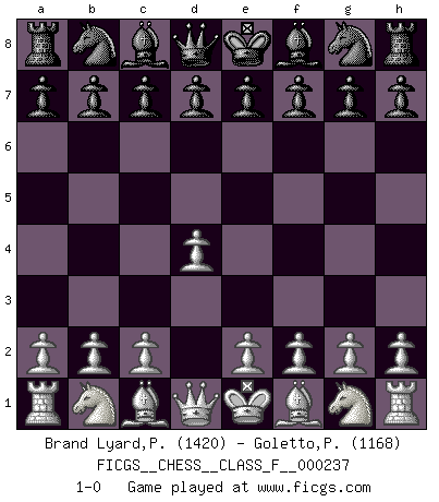Last move : 1-0 2025 April 4 13:23:5 [Event "FICGS__CHESS__CLASS_F__000237"] [Site "FICGS"] [Date "2025.02.23"] [Round "1"] [White "Brand Lyard,Paul"] [Black "Goletto,Piero Giuseppe"] [Result "1-0"] [WhiteElo "1420"] [BlackElo "1168"] 1.d4 1-0 This chess game has been lost on time (started : 2025.02.23 8:59:29) Follow this game move after move (download)The hardest game to win is a won game. (Emanuel Lasker) Ich moechte nie einem Club beitreten, der Leute wie mich als Mitglieder aufnimmt. (Woody Allen) La maestría del Ajedrez consiste esencialmente en analizar posiciónes de Ajedrez con precisión. (Mikhail Botvinnik) Comme les marins qui ont mille raisons différentes d'aller en mer, les joueurs d'échecs en ont tout autant avant de s'installer devant une table et jouer... (Vincent Bertignac, philosophe) Wisdom begins at the end. (Daniel Webster)