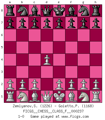 Last move : 1-0 2025 April 17 17:7:50 [Event "FICGS__CHESS__CLASS_F__000237"] [Site "FICGS"] [Date "2025.02.23"] [Round "1"] [White "Zemlyanov,Sergey"] [Black "Goletto,Piero Giuseppe"] [Result "1-0"] [WhiteElo "1226"] [BlackElo "1168"] 1.d4 1-0 This chess game has been lost on time (started : 2025.02.23 8:59:29) Follow this game move after move (download)Adequate compensation for a sacrifice is having a sound combination leading to a winning position; adequate compensation for a blunder is having your opponent snatch defeat from the jaws of victory. (Bruce A. Moon) Schach ist gnadenlos. Du mußt bereit sein zu töten. (Nigel Short) Cada Peón es una Reina en potencia. (James Mason) Vous n'êtes pas toujours obligé de jouer le meilleur coup. Un coup doit être actif, entreprenant, correct et beau ! (David Bronstein) The good fighters of old first put themselves beyond the possibility of defeat, and then waited for an opportunity of defeating the enemy. (Sun Tzu)