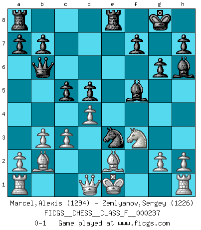 Last move : 0-1 2025 May 19 6:3:21 [Event "FICGS__CHESS__CLASS_F__000237"] [Site "FICGS"] [Date "2025.02.23"] [Round "1"] [White "Marcel,Alexis"] [Black "Zemlyanov,Sergey"] [Result "0-1"] [WhiteElo "1294"] [BlackElo "1226"] 1.f4 d5 2.Nf3 g6 3.b3 Bg7 4.c3 c5 5.Bb2 Nc6 6.e3 Qb6 7.d3 Nh6 8.Nbd2 O-O 9.Be2 e5 10.fxe5 Nf5 11.Kf2 Nxe5 12.Nxe5 Bxe5 13.Nf3 Bg7 14.Qd2 Bh6 15.Qc2 Nxe3 16.Qb1 Ng4+ 17.Ke1 Re8 18.d4 Bf5 19.Qd1 Ne3 0-1 Follow this game move after move (download)A thorough understanding of the typical mating continuations makes the most complicated sacrificial combinations leading up to them not only not difficult, but almost a matter of course. (Siegbert Tarrasch) Gewinnen beim Schach fördert das Selbstvertrauen. Beim Sex spüre ich sowas nicht... (Garry Kasparov) Muchos se han convertido en Maestros de Ajedrez, nadie se ha convertido en el Maestro del Ajedrez. (Siegbert Tarrasch) Votre seul travail dans les ouvertures est d'obtenir un milieu de partie jouable. (Lajos Portish) The real danger is not that computers will begin to think like men, but that men will begin to think like computers. (Sydney J. Harris)