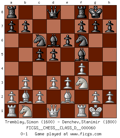 Last move : 0-1 2007 November 15 7:14:6 [Event "FICGS__CHESS__CLASS_D__000060"] [Site "FICGS"] [Date "2007.09.29"] [Round "1"] [White "Tremblay,Simon"] [Black "Denchev,Stanimir"] [Result "0-1"] [WhiteElo "1600"] [BlackElo "1800"] 1.b3 d5 2.Bb2 Nf6 3.f4 c5 4.Nf3 Nc6 5.e3 Bf5 6.d3 e6 7.Be2 Bd6 8.O-O O-O 0-1 This chess game has been lost on time (started : 2007.09.29 16:38:43) Nimzovich-Larsen attack : Classical variation Kingside Castling by player White (move 8) Kingside Castling by player Black (move 8) Player Black won this chess game. Follow this game move after move (download)If a ruler does not understand Chess, how can he rule over a kingdom ? (King Khusros II) Ein Remis kann durch Wiederholung von drei Zügen oder durch einen schlechte Zug erreicht werden. (Savielly Grigorievitsch Tartakower) Todavía soy una víctima del Ajedrez. Tiene toda la belleza del arte y mucho mas. No puede ser comercializado. El Ajedrez es mas puro que el arte en su posición social. (Marcel Duchamp) D'abord les bases : Jouez et étudiez, puis étudiez et jouez, ensuite jouez et étudiez, puis étudiez et jouez. Deuxièmement : Donnez toujours le meilleur de vous-même ! (Ken Smith) To err is human, but to really foul things up requires a computer. (Farmer's Almanac, 1978)