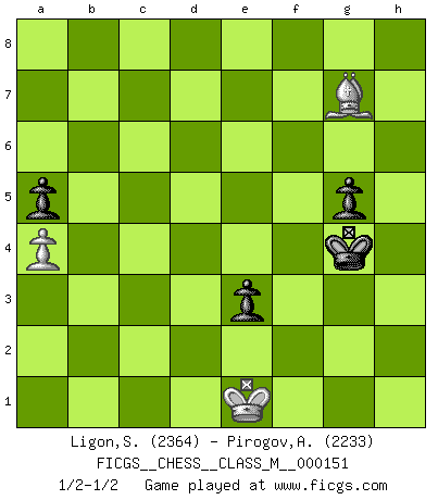 Last move : 1/2-1/2 2025 May 3 17:47:3 [Event "FICGS__CHESS__CLASS_M__000151"] [Site "FICGS"] [Date "2025.02.24"] [Round "1"] [White "Ligon,Scott"] [Black "Pirogov,Andrey Mikhaylovich"] [Result "1/2-1/2"] [WhiteElo "2364"] [BlackElo "2233"] 1.e4 e5 2.Nf3 Nc6 3.Bb5 a6 4.Ba4 Nf6 5.O-O Nxe4 6.d4 b5 7.Bb3 d5 8.dxe5 Be6 9.c3 Bc5 10.Nbd2 O-O 11.Bc2 Nxf2 12.Rxf2 Bxf2+ 13.Kxf2 f6 14.Nf1 fxe5 15.Kg1 Bg4 16.Ne3 Be6 17.b3 d4 18.cxd4 Nxd4 19.Nxd4 Qxd4 20.Rb1 Rad8 21.h3 h6 22.Rb2 Qxb2 23.Bxb2 Rxd1+ 24.Bxd1 Rd8 25.Bc2 Rd2 26.Bc1 Rd7 27.Kf2 Kf7 28.Ke2 Kf6 29.Ng4+ Bxg4+ 30.hxg4 c5 31.Bd2 c4 32.bxc4 Rc7 33.Ba5 Rc8 34.Bb6 bxc4 35.Ba5 c3 36.Kd3 Kg5 37.Bxc3 Kf4 38.Bd1 e4+ 39.Kd2 g5 40.a4 Rd8+ 41.Ke1 Rc8 42.Bb4 Rc4 43.Ba3 a5 44.Kf2 e3+ 45.Kf1 Rd4 46.Bf3 Rd2 47.Bf8 Rf2+ 48.Ke1 Rxf3 49.gxf3 Kxf3 50.Bxh6 Kxg4 51.Bg7 1/2-1/2 Follow this game move after move (download)Life is a kind of Chess, with struggle, competition, good and ill events. (Benjamin Franklin) Ein unbeabsichtigtes Patt ist der Gipfel der Dummheit. (Anonymous) No es una movida, aún la mejor movida que tu debas buscar, sino un plan comprensible. (Eugene Znosko-Borovsky) Les Echecs représentent une sphère d'idées créatrices basée sur la volonté des deux protagonistes. (Smyslov) Gambling : The sure way of getting nothing from something. (Wilson Mizner)