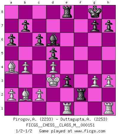 Last move : 1/2-1/2 2025 June 10 17:49:20 [Event "FICGS__CHESS__CLASS_M__000151"] [Site "FICGS"] [Date "2025.02.24"] [Round "1"] [White "Pirogov,Andrey Mikhaylovich"] [Black "Duttagupta,Aniruddha"] [Result "1/2-1/2"] [WhiteElo "2233"] [BlackElo "2253"] 1.b3 e5 2.Bb2 Nc6 3.e3 d5 4.Bb5 Bd6 5.f4 Qh4+ 6.g3 Qe7 7.Nf3 f6 8.Nc3 Be6 9.fxe5 fxe5 10.d4 e4 11.Ne5 Qg5 12.Nxc6 a6 13.Ba4 Nf6 14.Ne5 c6 15.b4 Qxe3+ 16.Ne2 Ng4 17.Nxg4 Bxg4 18.Qd2 Qxd2+ 19.Kxd2 O-O 20.h3 e3+ 21.Kd3 Bxe2+ 22.Kxe2 Rf2+ 23.Kd3 Re8 24.Rae1 Rd2+ 25.Kc3 Rf2 26.Kd3 1/2-1/2 Follow this game move after move (download)Fischer, who may or may not be mad as a hatter, has every right to be horrified. (Jeremy Silman) Ich war schon mal beim Dopingtest. Da musste ich Urin abgeben, während Dritte zusahen. (Elisabeth Pähtz) Un Peón pasado es un criminal, quién debe ser mantenido bajo candado y llave. Leves medidas, tales como vigilancia policiaca, no son suficientes. (Aaron Nimzovich) Nous sommes les pions de la mystérieuse partie d'Echecs jouée par Dieu. Il nous déplace, nous arrête, nous pousse encore, puis nous lance un à un dans la boîte du Néant. Epitaphe sur la tombe de David Janowsky (1868-1927). Computers have lots of memory but no imagination. (Anonymous)