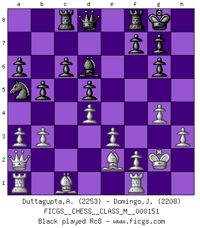 Last move : 1/2-1/2 2025 August 17 12:13:47 [Event "FICGS__CHESS__CLASS_M__000151"] [Site "FICGS"] [Date "2025.02.24"] [Round "1"] [White "Duttagupta,Aniruddha"] [Black "Domingo,Jordi"] [Result "1/2-1/2"] [WhiteElo "2253"] [BlackElo "2208"] 1.d4 d5 2.c4 dxc4 3.Nf3 Nf6 4.e3 Bg4 5.Bxc4 e6 6.Nc3 Nc6 7.O-O Bd6 8.h3 Bh5 9.Be2 a6 10.a3 O-O 11.g4 Bg6 12.Nh4 Nd5 13.Nxg6 hxg6 14.Nxd5 exd5 15.Qb3 Na5 16.Qa2 b5 17.Kg2 c6 18.b3 Rc8 19.a4 Nb7 20.Bd2 Bb8 21.axb5 axb5 22.Qc2 Nd6 23.Bb4 f5 24.Ra6 Qc7 25.f4 Qb7 26.R6a1 Qd7 27.Rf3 fxg4 28.Rg3 Nf5 29.Bxf8 Nxg3 30.Kxg3 Rxf8 31.Bxg4 Qd6 32.Qc5 g5 33.Qxd6 Bxd6 34.Kf3 gxf4 35.Ra6 fxe3 36.Kxe3 Rf6 37.Bd7 Bh2 38.Bxc6 Bg1+ 39.Kd2 Bxd4 40.Bxb5 Rxa6 1/2-1/2 Follow this game move after move (download)One of these modest little moves may be more embarrassing to your opponent than the biggest threat. (Siegbert Tarrasch) Schach ist mein Leben, meine Leidenschaft, was ich gelernt habe und seit meinem 14. Lebensjahr profimässig praktiziere. Darauf zu verzichten, würde mir sehr schwer fallen. (Viktor Kortschnoi) Nos gusta pensar. (Gary Kasparov) Il vaut mieux sacrifier les pièces de l'adversaire. (Xavier Tartacover) Children in the dark cause accidents, accidents in the dark cause children. (Unknown)