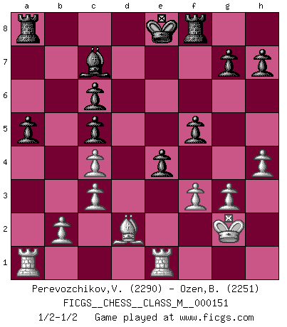 Last move : 1/2-1/2 2025 March 29 0:12:40 [Event "FICGS__CHESS__CLASS_M__000151"] [Site "FICGS"] [Date "2025.02.24"] [Round "1"] [White "Perevozchikov,Vjacheslav"] [Black "Ozen,Bahadir"] [Result "1/2-1/2"] [WhiteElo "2290"] [BlackElo "2251"] 1.Nf3 c5 2.g3 Nf6 3.Bg2 Nc6 4.O-O e5 5.e4 d6 6.c3 Nxe4 7.d4 f5 8.dxe5 dxe5 9.Qb3 Qb6 10.Na3 Qxb3 11.axb3 Be6 12.Nc4 Bxc4 13.bxc4 Be7 14.Re1 a5 15.h4 Rf8 16.Nd2 Nxd2 17.Bxc6+ bxc6 18.Bxd2 e4 19.f3 Bd6 20.Kg2 Bc7 1/2-1/2 Follow this game move after move (download)When you are lonely, when you feel yourself an alien in the world, play Chess. This will raise your spirits and be your counselor in war. (Aristotle) Sie führen leise Selbstgespräche, schlürfen lautstark ihre Getränke, schmatzen hörbar beim Essen, blasen ihrem Gegenüber Rauch in die Augen, niesen ihm ins Gesicht, starren ihn unverwandt an, bis er sich unter ihren Blicken windet, rutschen ständig auf ihrem Stuhl hin und her, rülpsen und bohren in der Nase. (Anonymous) El Jaque al descubierto es el bombardero del tablero. (Reuben Fine) Plusieurs personnes se sont demandées comment Tal faisait pour gagner... En fait, c'est très simple ! Il met ses pièces au centre de l'échiquier et les sacrifie quelque part ! (David Bronstein) Chess is everything: art, science and sport. (Anatoly Karpov)