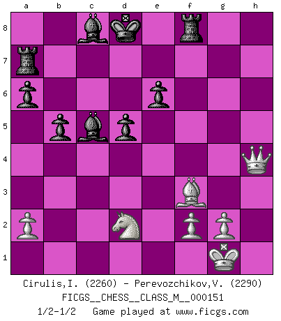 Last move : 1/2-1/2 2025 April 28 13:9:39 [Event "FICGS__CHESS__CLASS_M__000151"] [Site "FICGS"] [Date "2025.02.24"] [Round "1"] [White "Cirulis,Ilmars"] [Black "Perevozchikov,Vjacheslav"] [Result "1/2-1/2"] [WhiteElo "2260"] [BlackElo "2290"] 1.d4 e6 2.e4 d5 3.e5 c5 4.Nf3 Nc6 5.c3 Qb6 6.Be2 cxd4 7.cxd4 Nh6 8.Bxh6 Qxb2 9.O-O Qxa1 10.Qb3 Nxd4 11.Nxd4 Qxd4 12.Bb5+ Kd8 13.Bg5+ f6 14.exf6 gxf6 15.Rd1 Qxd1+ 16.Qxd1 fxg5 17.h4 gxh4 18.Qd4 Rg8 19.Qxh4+ Be7 20.Qxh7 Rf8 21.Nd2 a6 22.Ba4 b5 23.Bd1 Bc5 24.Bf3 Ra7 25.Qh4+ 1/2-1/2 Follow this game move after move (download)White lost because he failed to remember the right continuation and had to think up the moves himself. (Siegbert Tarrasch) Kein Schachspieler kann gut schlafen. (H. G. Wells) El Ajedrez es en su esencia, un juego. En su forma, un arte. Y en su ejecución, una ciencia. (Baron Tassilo) Le succès, c'est être capable d'aller d'échec en échec sans perdre son enthousiasme. (Winston Churchill) A married woman is like a fish riding a bicycle. (Rodolfo d'Ettorre)