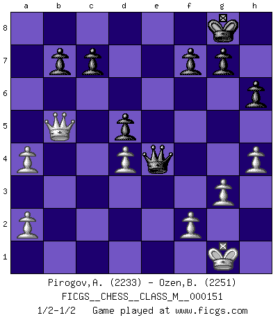 Last move : 1/2-1/2 2025 May 19 14:3:48 [Event "FICGS__CHESS__CLASS_M__000151"] [Site "FICGS"] [Date "2025.02.24"] [Round "1"] [White "Pirogov,Andrey Mikhaylovich"] [Black "Ozen,Bahadir"] [Result "1/2-1/2"] [WhiteElo "2233"] [BlackElo "2251"] 1.b3 e5 2.Bb2 Nc6 3.e3 Nf6 4.Nf3 e4 5.Nd4 Bc5 6.d3 Nxd4 7.exd4 Bb4+ 8.c3 Be7 9.dxe4 Nxe4 10.Bd3 d5 11.O-O O-O 12.Nd2 Nxd2 13.Qxd2 Bd6 14.Rfe1 Qf6 15.Qc1 Bd7 16.Ba3 Rfe8 17.Bxd6 Qxd6 18.Qd2 h6 19.h4 Qf6 20.g3 a5 21.Rxe8+ Rxe8 22.Re1 Rxe1+ 23.Qxe1 a4 24.Qc1 Bh3 25.bxa4 Qf3 26.Bf1 Bxf1 27.Qxf1 Qxc3 28.Qb5 Qe1+ 29.Kg2 Qe4+ 30.Kg1 1/2-1/2 Follow this game move after move (download)Bobby is the most misunderstood, misquoted celebrity walking the face of this earth. (Yasser Seirawan) Sicherlich können nur Meister einen Stil haben. Daß ein nicht-Meister auch nur ein einziges Mal in seinem Leben eine Partie folgerecht durchführte, habe ich niemals bemerkt. (Emanuel Lasker) Los problemas de Ajedrez exigen del compositor las mismas virtudes que caracterizan todo el arte de valor: originalidad, invención, concisión, armonía, complejidad e insinceridad explendida. (Vladimir Nabokov) On est toujours la mazette de quelqu'un d'autre. (Anonyme) There's always a bigger fish. (Qui-Gon Jinn in Star Wars ep.1)