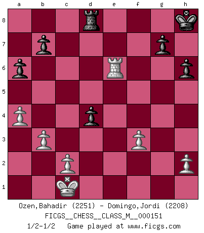 Last move : 1/2-1/2 2025 March 14 15:48:25 [Event "FICGS__CHESS__CLASS_M__000151"] [Site "FICGS"] [Date "2025.02.24"] [Round "1"] [White "Ozen,Bahadir"] [Black "Domingo,Jordi"] [Result "1/2-1/2"] [WhiteElo "2251"] [BlackElo "2208"] 1.e4 e5 2.Nf3 d6 3.d4 exd4 4.Nxd4 Nf6 5.Nc3 Be7 6.Bf4 O-O 7.Qd2 Nc6 8.O-O-O Nxd4 9.Qxd4 a6 10.e5 dxe5 11.Qxe5 Bd6 12.Qd4 Bxf4+ 13.Qxf4 Qe7 14.Bc4 Be6 15.Rhe1 Rad8 16.Rxd8 Rxd8 17.Bxe6 fxe6 18.Ne4 Rf8 19.f3 Nxe4 20.Qxe4 Qg5+ 21.Kb1 Qxg2 22.Qxe6+ Kh8 23.Qf7 Rg8 24.a4 h6 25.Qf4 c5 26.Re6 Rd8 27.b3 Qg1+ 28.Kb2 Qd4+ 29.Qxd4 cxd4 30.Kc1 1/2-1/2 Follow this game move after move (download)Alekhine is a poet who creates a work of art out of something that would hardly inspire another man to send home a picture post card. (Max Euwe) Bobby Fischer ist kein Vorbild für die heutige Jugend. (Viktor Kortschnoi) El Ajedrez, como la música, como el amor, tiene el poder de hacer feliz a la gente. (Siegbert Tarrasch) Les pièces de l'échiquier étaient impitoyables. Elles le retenaient, elles l'absorbaient. Il y avait de l'horreur en cela, mais aussi une harmonie unique. Car, qu'y a-t-il dans le monde, à part les échecs ? (V. Nabokov) Thus, what is of supreme importance in war is to attack the enemy's strategy. (Sun Tzu)