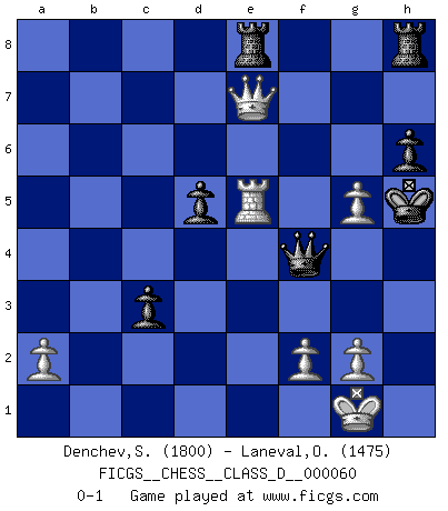 Last move : 0-1 2007 November 1 13:52:47 [Event "FICGS__CHESS__CLASS_D__000060"] [Site "FICGS"] [Date "2007.09.29"] [Round "1"] [White "Denchev,Stanimir"] [Black "Laneval,Olivier"] [Result "0-1"] [WhiteElo "1800"] [BlackElo "1475"] 1.d4 e6 2.e4 d5 3.e5 c5 4.c3 Nc6 5.Nf3 Bd7 6.Bd3 f6 7.O-O Qb6 8.Re1 c4 9.Bc2 O-O-O 10.b3 fxe5 11.bxc4 dxc4 12.Nxe5 Nxe5 13.Rxe5 Bd6 14.Be3 Bxe5 15.dxe5 Qb2 16.Nd2 Qxc3 17.Bxa7 Bc6 18.Be3 Qxe5 19.Qf1 c3 20.Nc4 Qf6 21.Nb6+ Kc7 22.Ba4 Ne7 23.Rc1 Nd5 24.Nxd5+ exd5 25.Bxc6 Kxc6 26.Rb1 Qe5 27.Qb5+ Kd6 28.Qxb7 Ke6 29.Bf4 Qxf4 30.Re1+ Kf6 31.Qe7+ Kg6 32.Re6+ Kh5 33.Re5+ g5 34.h4 h6 35.hxg5 Rde8 0-1 Queen's pawn Kingside Castling by player White (move 7) Queenside Castling by player Black (move 9) Player Black won this chess game. Follow this game move after move (download)Chess demands total concentration. (Bobby Fischer) Schach ist ein Reich, wo sich die menschliche Phantasie frei entfalten kann. (David Bronstein) El Ajedrez demanda una total concentración. (Bobby Fischer) Les échecs, c'est la lutte contre l'erreur. (Johannes Zukertort) Every now and then a man's mind is stretched by a new idea and never shrinks back to its former dimensions. (Oliver Wendell Holmes, Sr.)