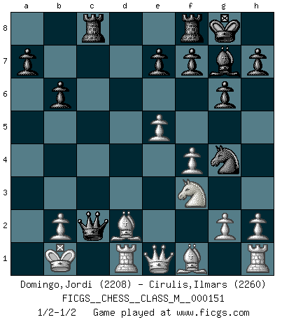 Last move : 1/2-1/2 2025 March 21 18:17:19 [Event "FICGS__CHESS__CLASS_M__000151"] [Site "FICGS"] [Date "2025.02.24"] [Round "1"] [White "Domingo,Jordi"] [Black "Cirulis,Ilmars"] [Result "1/2-1/2"] [WhiteElo "2208"] [BlackElo "2260"] 1.e4 d6 2.d4 Nf6 3.Nc3 g6 4.f4 Bg7 5.Nf3 c5 6.dxc5 Qa5 7.Qd4 O-O 8.Bd2 Nc6 9.Qc4 Be6 10.Qb5 Qc7 11.O-O-O Rac8 12.Kb1 dxc5 13.Qxc5 b6 14.Qe3 Ng4 15.Qe1 Nb4 16.e5 Bxa2+ 17.Nxa2 Qxc2+ 18.Ka1 Nxa2 19.Kxa2 Qa4+ 20.Kb1 Qc2+ 1/2-1/2 Follow this game move after move (download)Not only will I predict his triumph over Botvinnik, but I'll go further and say that he'll probably be the greatest Chess player that ever lived. (John Collins) Kann Schach nicht schließlich das Nationalspiel der Deutschen werden? Und welche weiteren Ausblicke bieten sich dann dar! Welche Hebung des allgemeinen Kultur-Niveaus, ja der Moral, wenn das Schachbrett den Kartentisch verdrängen würde! Wahrlich, ein Ziel, des Schweißes der Edlen wert! (Siegbert Tarrasch) No es una movida, aún la mejor movida que tu debas buscar, sino un plan comprensible. (Eugene Znosko-Borovsky) Il s'avisa de me proposer d'apprendre les échecs qu'il jouait un peu... me voilà forcené des échecs. J'achète un échiquier, je m'enferme dans ma chambre, j'y passe des jours et des nuits à vouloir apprendre par cur toutes les parties. (Jean-Jacques Rousseau, Confessions) Programming can only do so much before it becomes too much. (Don Groves)