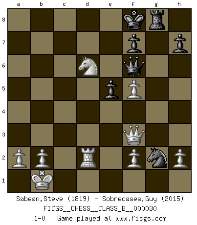 Last move : 1-0 2008 June 23 10:51:42 [Event "FICGS__CHESS__CLASS_B__000030"] [Site "FICGS"] [Date "2007.09.30"] [Round "1"] [White "Sabean,Steve"] [Black "Sobrecases,Guy"] [Result "1-0"] [WhiteElo "1819"] [BlackElo "2015"] 1.e4 c5 2.Nf3 Nc6 3.Nc3 e6 4.d4 cxd4 5.Nxd4 Nf6 6.Ndb5 d6 7.Bf4 e5 8.Bg5 a6 9.Na3 b5 10.Nd5 Be7 11.Bxf6 Bxf6 12.c3 Ne7 13.Nxf6+ gxf6 14.Bd3 Bb7 15.Qe2 f5 16.exf5 b4 17.cxb4 Nd5 18.O-O-O Nf4 19.Qe3 Bxg2 20.Rhg1 Qf6 21.Bc2 Rc8 22.Kb1 Kf8 23.b5 axb5 24.Nxb5 Bd5 25.Rd2 Rg8 26.Rgd1 Ng2 27.Qb6 Rc6 28.Qb7 Bf3 29.Nxd6 Rxc2 30.Qxf3 Rxd2 31.Rxd2 1-0 Comment by player 1 : Steve Sabean : Greetings from Glen Burnie, Maryland, USA. I hope you enjoy our game. Sicilian defense Queenside Castling by player White (move 18) Player White won this chess game. Follow this game move after move (download)There are two classes of men; those who are content to yield to circumstances and who play whist; those who aim to control circumstances, and who play Chess. (Mortimer Collins) Ein unbeabsichtigtes Patt ist der Gipfel der Dummheit. (Anonymous) Aquellos que dicen que entienden al Ajedrez, no entienden nada. (Robert Hubner) Ce qui caractérise les parties de combat, c'est que si le défenseur a constamment de difficiles problèmes à résoudre, l'attaquant doit chercher sans relâche de nouvelles possibilités d'attaque. (Koblentz) Industry executives and analysts often mistakenly talk about strategy as if it were some kind of chess match. But in chess, you have just two opponents, each with identical resources, and with luck playing a minimal role. The real world is much more like a poker game, with multiple players trying to make the best of whatever hand fortune has dealt them. In our industry, Bill Gates owns the table until someone proves otherwise. (David Moschella, 'Computerworld')