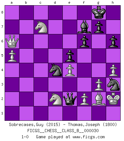Last move : 1-0 2008 June 7 11:53:26 [Event "FICGS__CHESS__CLASS_B__000030"] [Site "FICGS"] [Date "2007.09.30"] [Round "1"] [White "Sobrecases,Guy"] [Black "Thomas,Joseph"] [Result "1-0"] [WhiteElo "2015"] [BlackElo "1800"] 1.e4 c5 2.Nf3 e6 3.d3 Nc6 4.Nbd2 d5 5.g3 Nf6 6.Bg2 Be7 7.O-O O-O 8.a4 dxe4 9.dxe4 e5 10.c3 Qc7 11.Qc2 Na5 12.b3 Rd8 13.Re1 Be6 14.Ng5 Bd7 15.Ngf3 Rac8 16.h3 h6 17.Ba3 Be6 18.Qb2 Nh7 19.b4 Nc6 20.bxc5 Na5 21.Qb5 Bxc5 22.Bxc5 Qxc5 23.Red1 f6 24.Rac1 a6 25.Qb1 Rd6 26.Nh4 Rcd8 27.Nf1 Nb3 28.Rxd6 Rxd6 29.Rc2 Rd3 30.Nf5 Rxc3 31.Rxc3 Qxc3 32.Ne7+ Kf8 33.Nd5 Qc4 34.a5 Ng5 35.Kh2 Nd4 36.Qxb7 Kg8 37.Nd2 Qe2 38.h4 Nh3 39.Nc7 Bf7 40.Qxa6 1-0 Sicilian defense Kingside Castling by player White (move 7) Kingside Castling by player Black (move 7) Player White won this chess game. Follow this game move after move (download)Up to this point White has been following well-known analysis. But now he makes a fatal error: he begins to use his own head. (Siegbert Tarrasch) Es gibt Leute, die glauben, alles wäre vernünftig, was man mit einem ernsthaften Gesicht tut. (Georg Christoph Lichtenberg) El sobresalir en el Ajedrez es un signo de una mente intrigante. (Sir Arthur Conan Doyle) On n'a jamais que l'âge auquel on a commence à jouer aux échecs car après on cesse de vieillir. (Capablanca) Knowledge rests not upon truth alone, but upon error also. (Carl G. Jung)