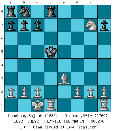 Last move : 1-0 2025 June 19 21:44:31 [Event "FICGS__CHESS__THEMATIC_TOURNAMENT__000270"] [Site "FICGS"] [Date "2025.02.27"] [Round "1"] [White "Upadhyay,Rajesh"] [Black "Alencar,Ofir"] [Result "1-0"] [WhiteElo "1832"] [BlackElo "1764"] 1.e4 e5 2.Nf3 d6 3.d4 exd4 4.Nxd4 d5 5.exd5 Qxd5 6.Nc3 Qd8 7.Bc4 Be6 8.Bxe6 fxe6 9.Nxe6 Qd7 10.Qxd7+ Kxd7 11.Nxf8+ Kc6 12.Ne6 Nf6 13.Nxg7 Nd5 14.Nxd5 Kxd5 15.Be3 Rd8 16.O-O-O 1-0 Follow this game move after move (download)A passed Pawn increases in strength as the number of pieces on the board diminishes. (Capablanca) Vom Schach wurde gesagt das Leben sei dafür nicht lange genug. Aber das ist der Fehler des Lebens, nicht des Schach'. (Irving Chernev) Aquellos que dicen entender al Ajedrez, no entienden nada. (Robert Hubner) La menace est plus forte que l'exécution. (Aaron Nimzovitch) The real danger is not that computers will begin to think like men, but that men will begin to think like computers. (Sydney J. Harris)