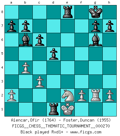 Last move : 0-1 2025 August 13 23:19:58 [Event "FICGS__CHESS__THEMATIC_TOURNAMENT__000270"] [Site "FICGS"] [Date "2025.02.27"] [Round "1"] [White "Alencar,Ofir"] [Black "Foster,Duncan"] [Result "0-1"] [WhiteElo "1764"] [BlackElo "1955"] 1.e4 e5 2.Nf3 d6 3.d4 exd4 4.Nxd4 Nf6 5.Bb5+ c6 6.Bd3 Qb6 7.Bg5 Qxd4 8.Bxf6 Qxf6 9.c3 Be7 10.Qf3 Qxf3 11.gxf3 Nd7 12.Rg1 O-O 13.Nd2 Ne5 14.Be2 f5 15.exf5 Bxf5 16.Ne4 d5 17.Ng3 Bg6 18.Rd1 Bc5 19.b4 Bb6 20.Rg2 Nxf3+ 21.Bxf3 Rxf3 22.Kd2 Rd3+ 23.Ke1 Re8+ 24.Ne2 Rxd1+ 0-1 Follow this game move after move (download)When asked, -How is that you pick better moves than your opponents?, I responded: I'm very glad you asked me that, because, as it happens, there is a very simple answer. I think up my own moves, and I make my opponent think up his. (Alexander Alekhine) Es ist schade, dass viele Schachsportler vergessen, wie wichtig Auftreten und angemessene Kleidung sind. (Alexandra Kosteniuk) El Ajedrez es un regaderazo frío para la mente. (Sir John Simon) Il vaut mieux sacrifier les pièces de l'adversaire. (Xavier Tartacover) It's only after you lost everything, Tyler says, that you're free to do anything. (Chuck Palahniuk, Fight Club)