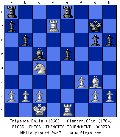 Last move : 1-0 2025 August 21 2:5:33 [Event "FICGS__CHESS__THEMATIC_TOURNAMENT__000270"] [Site "FICGS"] [Date "2025.02.27"] [Round "1"] [White "Trigance,Emile"] [Black "Alencar,Ofir"] [Result "1-0"] [WhiteElo "1868"] [BlackElo "1764"] 1.e4 e5 2.Nf3 d6 3.Bc4 Be6 4.Bxe6 fxe6 5.d4 exd4 6.Nxd4 e5 7.Ne6 Qd7 8.Qh5+ g6 9.Qh3 Ke7 10.Ng5 Qxh3 11.Nxh3 h6 12.f3 Nf6 13.Nc3 Ke6 14.Be3 c6 15.O-O-O d5 16.exd5+ Nxd5 17.Nxd5 cxd5 18.Rhe1 Nd7 19.Bf2 b6 20.Nf4+ Kf6 21.Nxd5+ Kg7 22.Bg3 Bd6 23.Ne3 Bc5 24.Nc4 Rhe8 25.Rxd7+ 1-0 This chess game has been lost on time (started : 2025.02.27 23:12:23) Follow this game move after move (download)For surely of all the drugs in the world, Chess must be the most permanently pleasurable. (Assiac) Der Traum, für den ich lebe, ist der von einem freien Russland. Viele mögen sagen: Russland hat doch ein Parlament, einen gewählten Präsidenten. Aber ich spüre, dass in meiner Heimat die Angst wiederkehrt. Eine Angst, sich frei zu äußern, bestimmte Dinge zu tun (Garry Kasparov) Yo jugué Ajedrez con el y a veces le pude haber ganado solo que siempre devuelve su última jugada y juega la partida de manera diferente. (Mark Twain) Les Echecs mettent en conflit, non pas deux intelligences, mais deux volontés. (Lasker) Work expands to fill the time available. (C. Northcote Parkinson, in Parkinson's Laws)