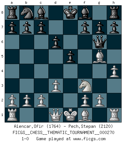Last move : 1-0 2025 May 12 21:37:10 [Event "FICGS__CHESS__THEMATIC_TOURNAMENT__000270"] [Site "FICGS"] [Date "2025.02.27"] [Round "1"] [White "Alencar,Ofir"] [Black "Pech,Stepan"] [Result "1-0"] [WhiteElo "1764"] [BlackElo "2120"] 1.e4 e5 2.Nf3 d6 3.Nc3 Nf6 4.Nd5 Nxe4 5.d3 Nf6 6.Nxf6+ Qxf6 7.Bg5 Qg6 8.h4 1-0 This chess game has been lost on time (started : 2025.02.27 23:12:23) Follow this game move after move (download)I won't play with you anymore. You have insulted my friend. - When an opponent cursed himself for a blunder. (Miguel Najdorf) Ja, ich habe einmal eine Blitzpartie gespielt, es war in einem Zug, 1929. --im Interview 1989 (Mikhail Moiseyevich Botvinik) Una compensación adecuada por un sacrificio es tener una combinación sólida que conduce a una posición ganadora; una compensación adecuada por una metida de pata es dejar a tu oponente arrebatar una derrota de las fauces de la victoria. (Bruce A. Moon) Les échecs sont un jeu terrible. Si vous n'avez pas le centre, votre adversaire a une position plus libre. Par contre, si vous avez le centre, alors vous avez vraiment quelque chose pour laquelle vous inquiéter ! (Siegbert Tarrasch) Animated gif is worth one mega-word. (Unknown)