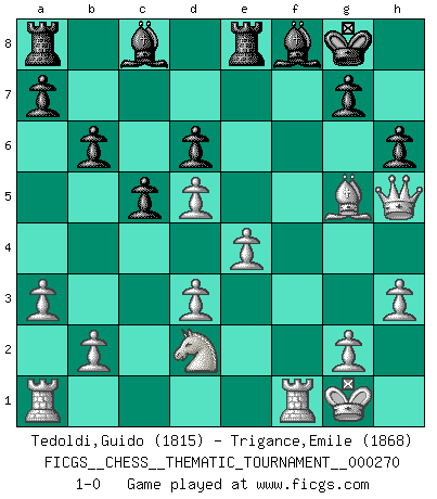 Last move : 1-0 2025 June 20 14:11:58 [Event "FICGS__CHESS__THEMATIC_TOURNAMENT__000270"] [Site "FICGS"] [Date "2025.02.27"] [Round "1"] [White "Tedoldi,Guido"] [Black "Trigance,Emile"] [Result "1-0"] [WhiteElo "1815"] [BlackElo "1868"] 1.e4 e5 2.Nf3 d6 3.c4 c5 4.Nc3 Nf6 5.h3 Be7 6.d3 O-O 7.Be2 h6 8.Be3 Nc6 9.O-O Re8 10.a3 Bf8 11.Nd5 Nxd5 12.cxd5 Ne7 13.Nd2 b6 14.f4 exf4 15.Bxf4 Ng6 16.Bh5 Qh4 17.Bxg6 fxg6 18.Qf3 g5 19.Bxg5 Qh5 20.Qxh5 1-0 Follow this game move after move (download)My opponents make good moves too. Sometimes I don't take these things into consideration. (Bobby Fischer) Mit Schach schule ich mein Gefühl für Geometrie, was für Tennis und Schach gleichermaßen wichtig ist. (Boris Becker) Un mal plan es mejor que no tener ningún plan. (Frank Marshall) Les échecs sont utiles à l'exercice de la faculté de penser et à celle de l'imagination. Car nous devons posséder une méthode élaborée pour atteindre des buts partout où nous devons conduire notre raison. (Leibnitz) History is a gallery of pictures in which there are few originals and many copies. (Alexis de Tocqueville)