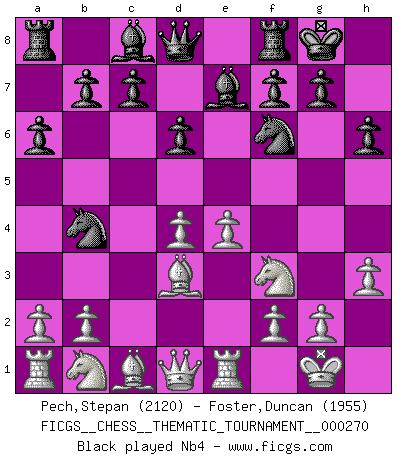 Last move : 1-0 2025 August 27 13:35:49 [Event "FICGS__CHESS__THEMATIC_TOURNAMENT__000270"] [Site "FICGS"] [Date "2025.02.27"] [Round "1"] [White "Pech,Stepan"] [Black "Foster,Duncan"] [Result "1-0"] [WhiteElo "2120"] [BlackElo "1955"] 1.e4 e5 2.Nf3 d6 3.Bc4 Nc6 4.c3 h6 5.d4 Nf6 6.O-O Be7 7.Re1 O-O 8.h3 a6 9.Bd3 exd4 10.cxd4 Nb4 11.Bf1 d5 12.e5 Ne4 13.a3 Nc6 14.Nc3 Nxc3 15.bxc3 Bf5 16.a4 Na5 17.Nh2 1-0 This chess game has been lost on time (started : 2025.02.27 23:12:23) Follow this game move after move (download)I believe that Chess possesses a magic that is also a help in advanced age. A rheumatic knee is forgotten during a game of Chess and other events can seem quite unimportant in comparison with a catastrophe on the chessboard. (Vlastimil Hort) Frage: Gibt es etwas was Sie mehr lieben als Autobahnen ohne Tempobegrenzungen? - Antwort: Deutsche Frauen ohne Tempobegrenzungen. (Loek van Wely) Las leyes del Ajedrez no permiten una libre elección: tienes que mover quieras o no. (Emanuel Lasker) Les Echecs sont et restent toujours un combat, un combat intégral comme la boxe, la lutte ou un autre sport, et où il doit y avoir un vainqueur et un vaincu. (Joseph Emil Diemer) The best teachers teach from the heart, not from the book. (Author unknown)
