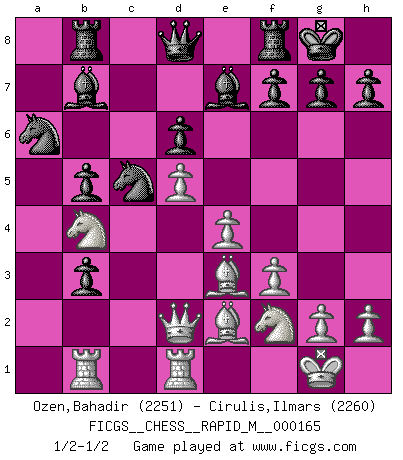 Last move : 1/2-1/2 2025 March 28 23:46:41 [Event "FICGS__CHESS__RAPID_M__000165"] [Site "FICGS"] [Date "2025.03.05"] [Round "1"] [White "Ozen,Bahadir"] [Black "Cirulis,Ilmars"] [Result "1/2-1/2"] [WhiteElo "2251"] [BlackElo "2260"] 1.e4 d6 2.d4 Nf6 3.f3 e6 4.Be3 Be7 5.c4 O-O 6.Nc3 c5 7.d5 a6 8.a4 exd5 9.cxd5 Nbd7 10.Be2 Rb8 11.Nh3 Ne8 12.O-O Nc7 13.Qd2 b5 14.axb5 axb5 15.b4 cxb4 16.Na2 b3 17.Nb4 Bb7 18.Rab1 Nc5 19.Rfd1 N7a6 20.Nf2 1/2-1/2 Follow this game move after move (download)Not all artists are Chess players, but all Chess players are artists. (Marcel Duchamp) Wer sich die Fähigkeit anerziehen will im Schach selbstständig zu denken, der muß alles meiden, was leblos ist: ausgeklügelte Theorien, die sich auf sehr wenige Beispiele und eine Menge Hirngespinste stützen. (Emanuel Lasker) No existe un remordimiento como el remordimiento del Ajedrez. (H. G. Wells) J'ai vu le vaincu d'Echecs jouer des années durant dans l'espoir de la fête de la victoire. Car tu es plus riche de ce qu'elle existe si même elle n'est point pour toi. Ainsi de la perle du fond des mers. (Antoine de Saint-Exupéry) Those parts of the system that you can hit with a hammer (not advised) are called hardware; those program instructions that you can only curse at are called software. (Anonymous)