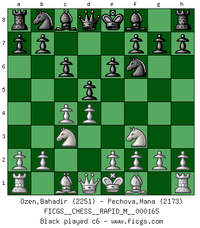 Last move : 1-0 2025 May 1 10:43:51 [Event "FICGS__CHESS__RAPID_M__000165"] [Site "FICGS"] [Date "2025.03.05"] [Round "1"] [White "Ozen,Bahadir"] [Black "Pechova,Hana"] [Result "1-0"] [WhiteElo "2251"] [BlackElo "2173"] 1.d4 d5 2.c4 e6 3.Nf3 Nf6 4.Nc3 c6 5.e3 Nbd7 6.Qc2 1-0 Follow this game move after move (download)The tactician must know what to do whenever something needs doing; the strategist must know what to do when nothing needs doing. (Savielly Tartakover) Dein Körper muss in Topform sein. Dein Schach verfällt, wenn dein Körper verfällt. Der Körper kann nicht vom Geist getrennt werden. (Robert James Fischer) Tu no necesitas jugar muy bien, únicamente ayudar a tu oponenet a que juegue muy mal. (Genrikh Chepukaitis) Plusieurs personnes se sont demandées comment Tal faisait pour gagner... En fait, c'est très simple ! Il met ses pièces au centre de l'échiquier et les sacrifie quelque part ! (David Bronstein) The problem with troubleshooting is that trouble shoots back. (Anonymous)