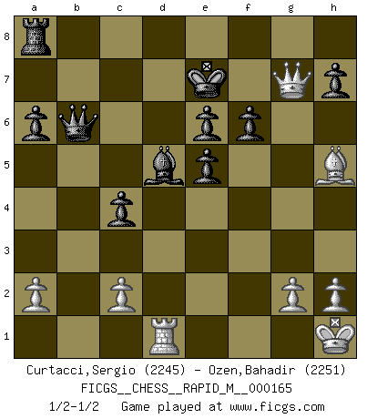 Last move : 1/2-1/2 2025 March 19 19:25:35 [Event "FICGS__CHESS__RAPID_M__000165"] [Site "FICGS"] [Date "2025.03.05"] [Round "1"] [White "Curtacci,Sergio"] [Black "Ozen,Bahadir"] [Result "1/2-1/2"] [WhiteElo "2245"] [BlackElo "2251"] 1.e4 c5 2.Nf3 d6 3.d4 cxd4 4.Nxd4 Nf6 5.Nc3 a6 6.Bg5 e6 7.f4 Qb6 8.Qd2 Qxb2 9.Rb1 Qa3 10.f5 Nc6 11.fxe6 fxe6 12.Nxc6 bxc6 13.Be2 Be7 14.e5 dxe5 15.Bxf6 Bxf6 16.Bh5+ Ke7 17.Rd1 Qc5 18.Ne4 Qd4 19.Qe2 Qb6 20.Qd3 Rd8 21.Qa3+ c5 22.O-O Rxd1 23.Rxd1 Bb7 24.Nxf6 gxf6 25.Qg3 c4 26.Kh1 Bd5 27.Qg7+ 1/2-1/2 Follow this game move after move (download)Chess is ruthless: you've got to be prepared to kill people. (Nigel Short) Wer der Ansicht ist, daß alle Schachspieler verrückt sind, wird durch Studium des Lebens von Emil Josef Diemer nicht auf andere Gedanken kommen. (Hans Ree) El Ajedrez es un invernadero donde los frutos del carácter pueden madurar mas completamente que en la vida. (Edward Morgan Foster) Echiquier : carré parfait, comme la Jérusalem nouvelle décrite par l'auteur de l'Apocalypse, huit cases sur huit, exaltation du chiffre 4, symbole du cosmos aux quatre horizons... où le noir et le blanc, l'ombre et la lumière, le mal et le bien s'entremêlent et se conjuguent. (Robert Couffignal, Le Gambit du poète) If only people were all showed a certain minimum level of niceness; if only people didn't retract verbal draw offers (without draw box ticked) on ficgs; if only people didn't kill; if only people didn't run concentration / extermination camps, if only people didn't drop nuclear bombs on Hiroshima and Nagasaki, and so on - it would be a much more beautiful world. But sadly, things are not so... (Normajean Yates)